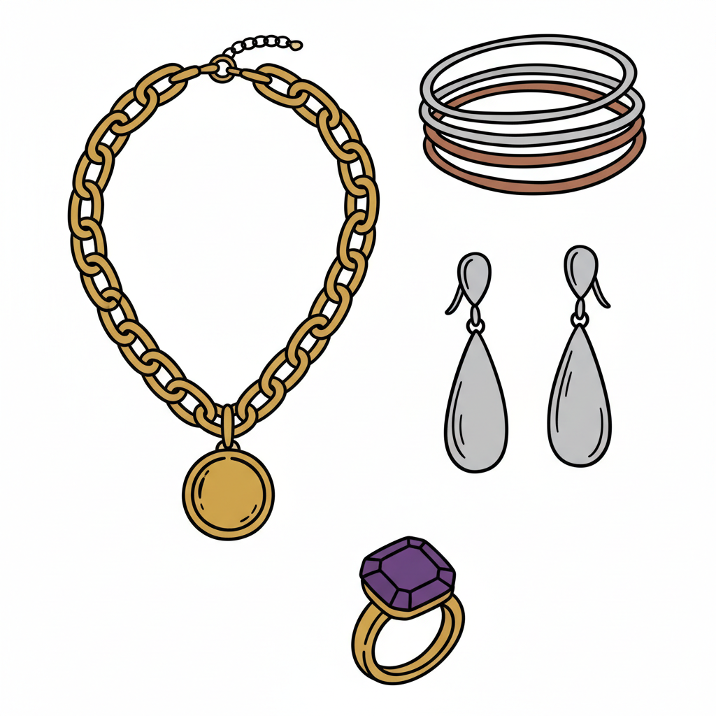 Illustration von Schmuck: goldene Kette, Armreifen, Ohrringe und Ring mit lila Stein.