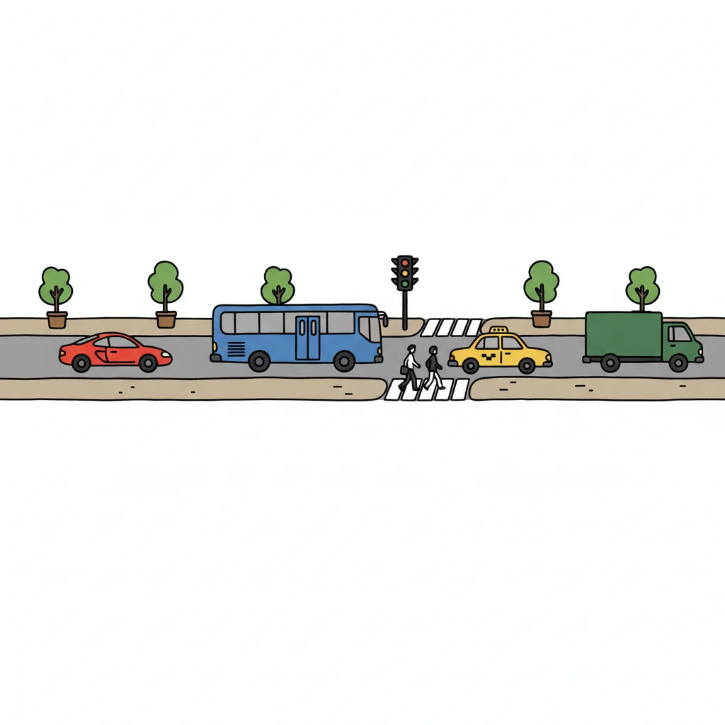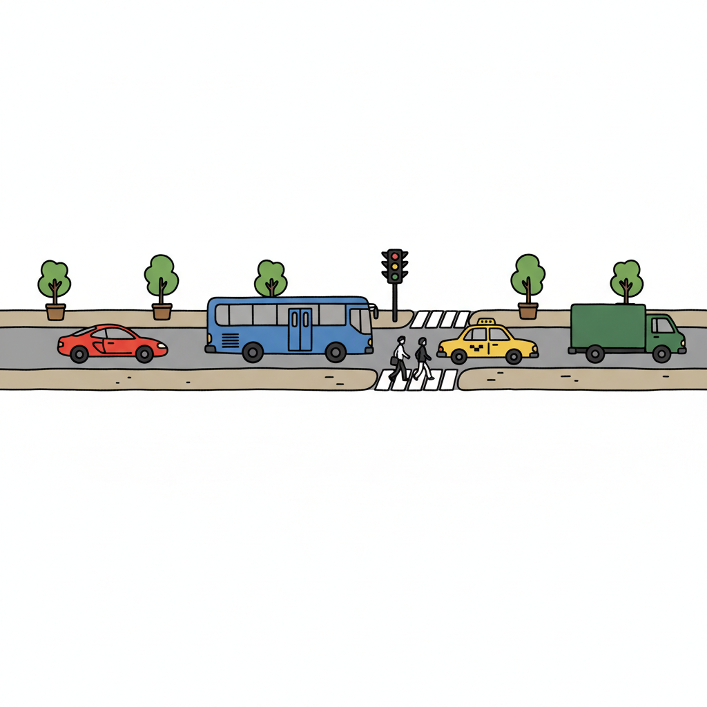 Illustration von Verkehrsteilnehmern: Auto, Radfahrer, Fußgänger am Zebrastreifen und Bus.