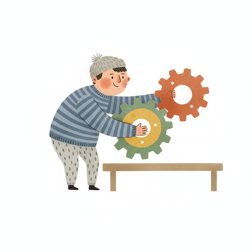 Cartoonfigur in Strickmütze setzt zwei große Zahnräder zusammen, symbolisiert Technik und Lernen.