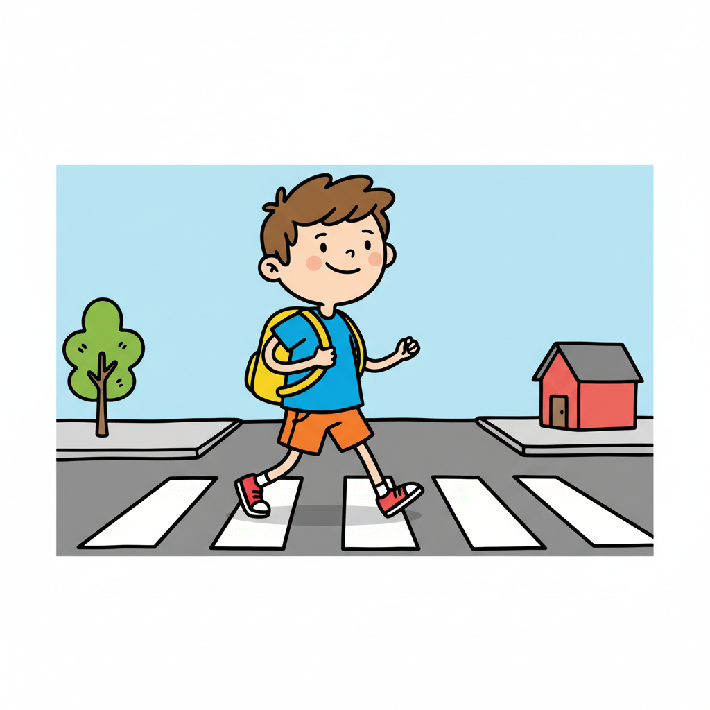 Fröhlicher Cartoon-Junge mit Rucksack überquert sicher einen Zebrastreifen auf der Straße.