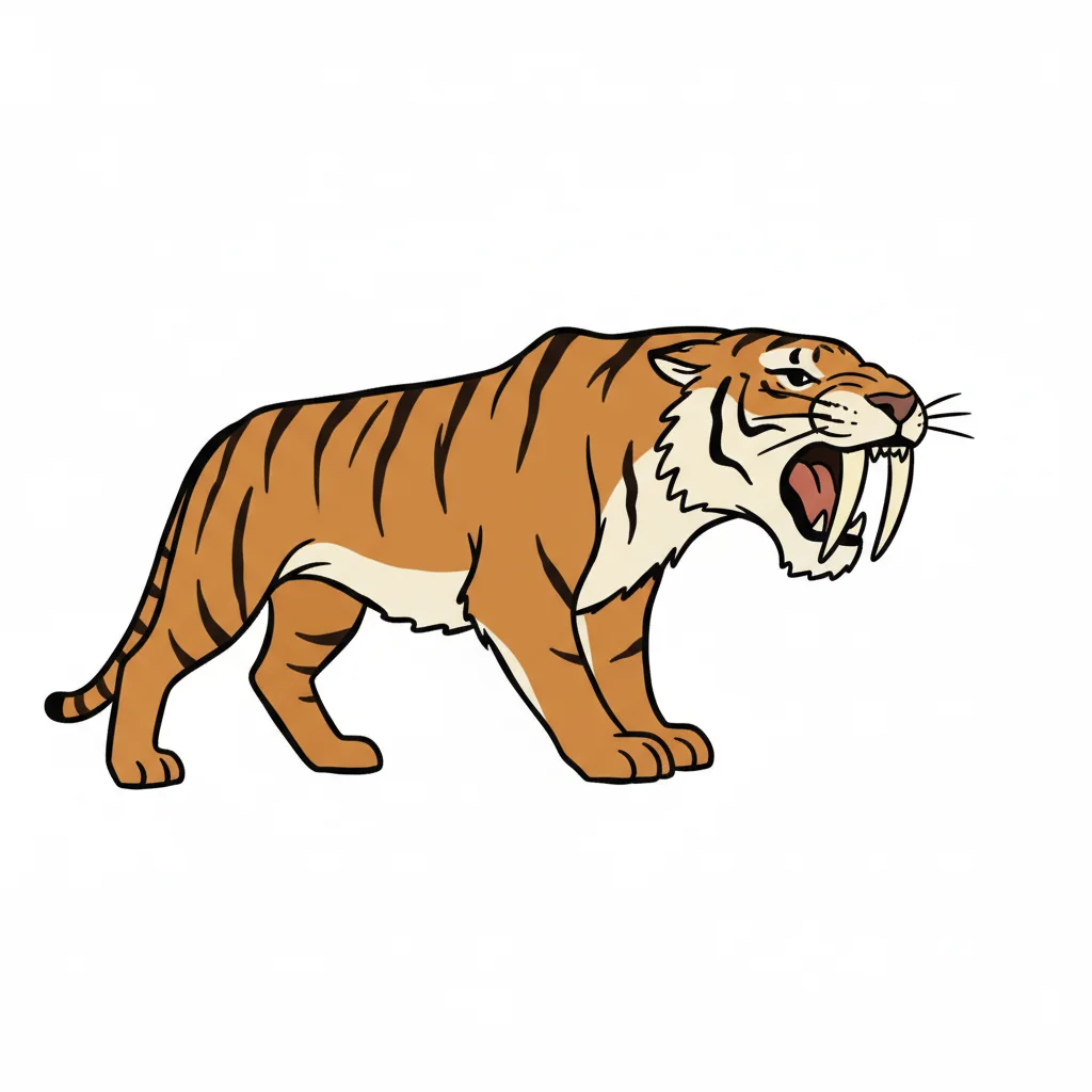 Cartoon-Stil Säbelzahntiger mit offenem Maul und großen Reißzähnen, braun mit schwarzen Streifen.