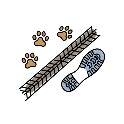 Illustration von Pfotenabdrücken, einem Reifenprofil und einem Schuhabdruck auf weißem Hintergrund.