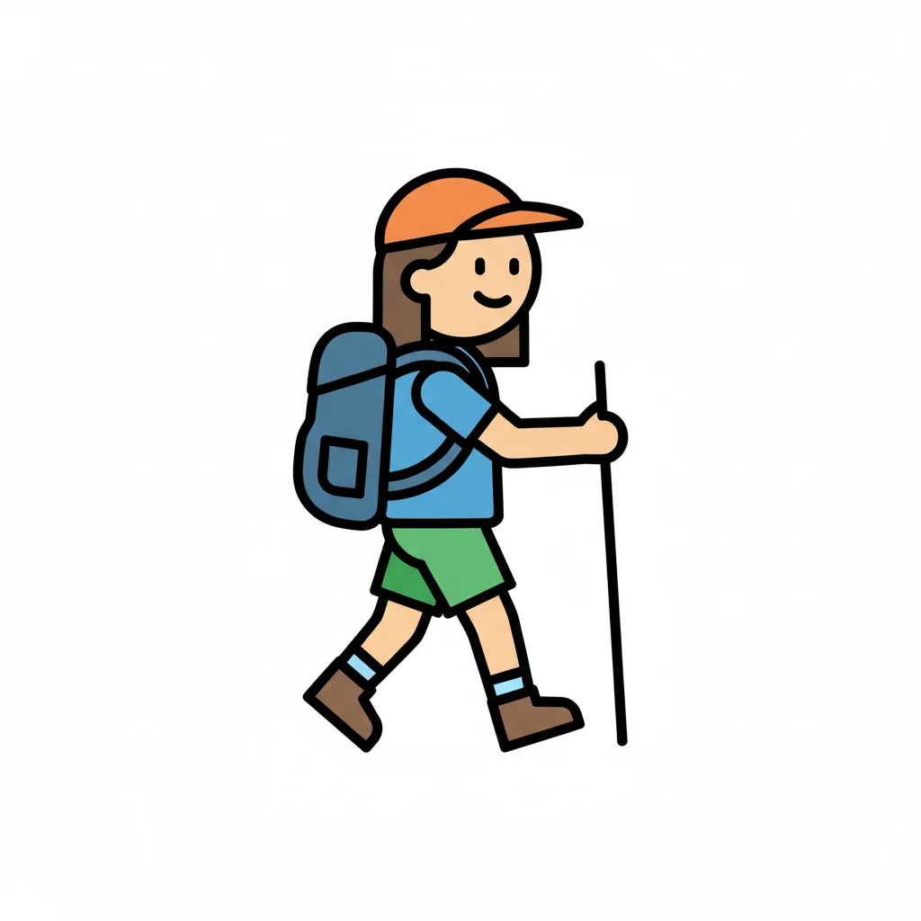 Ein wanderndes Kind mit Rucksack und Wanderstock in sportlicher Kleidung.