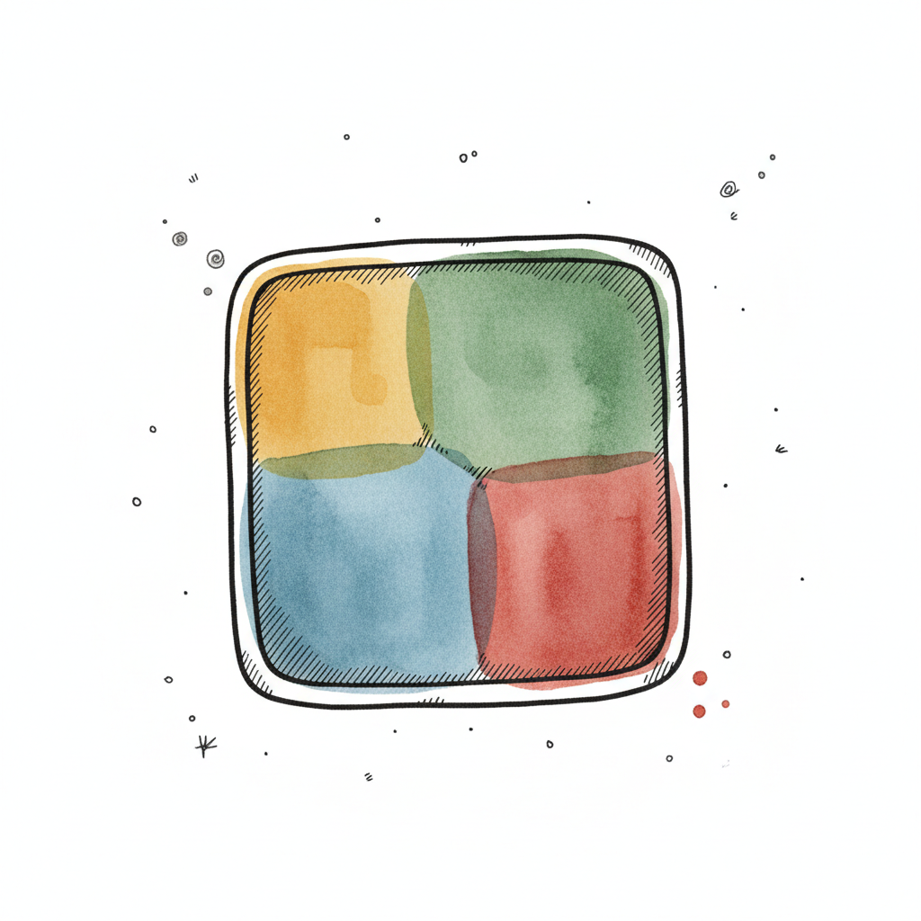 Aquarell-Illustration eines Symbols mit vier farbigen Quadraten (gelb, grün, blau, rot) in einem abgerundeten Rahmen.