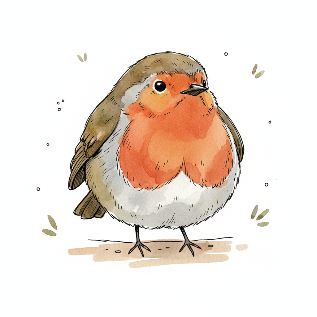 Niedliches, rundes Rotkehlchen in Aquarell- und Skizzenstil mit roter Brust.