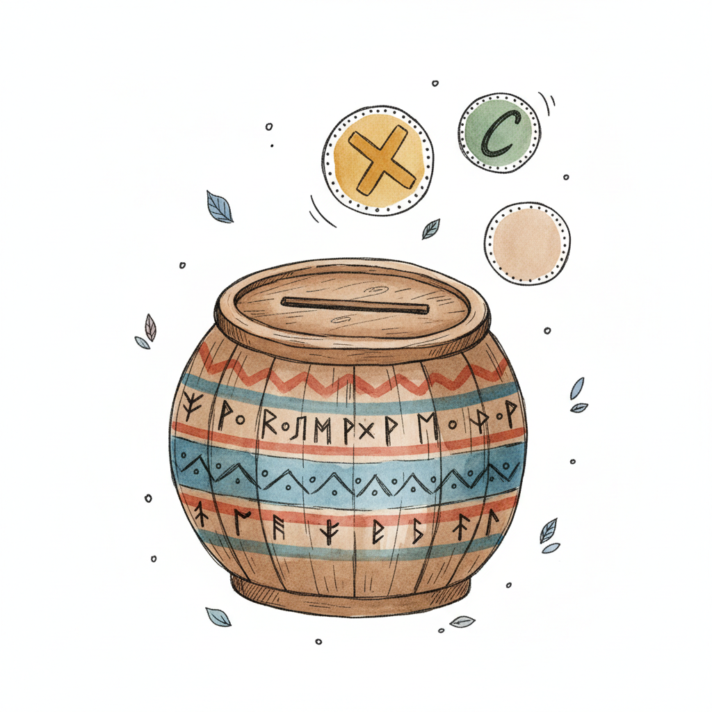 Aquarell-Illustration eines Holzfasses mit Runenmuster und fallenden Münzen.