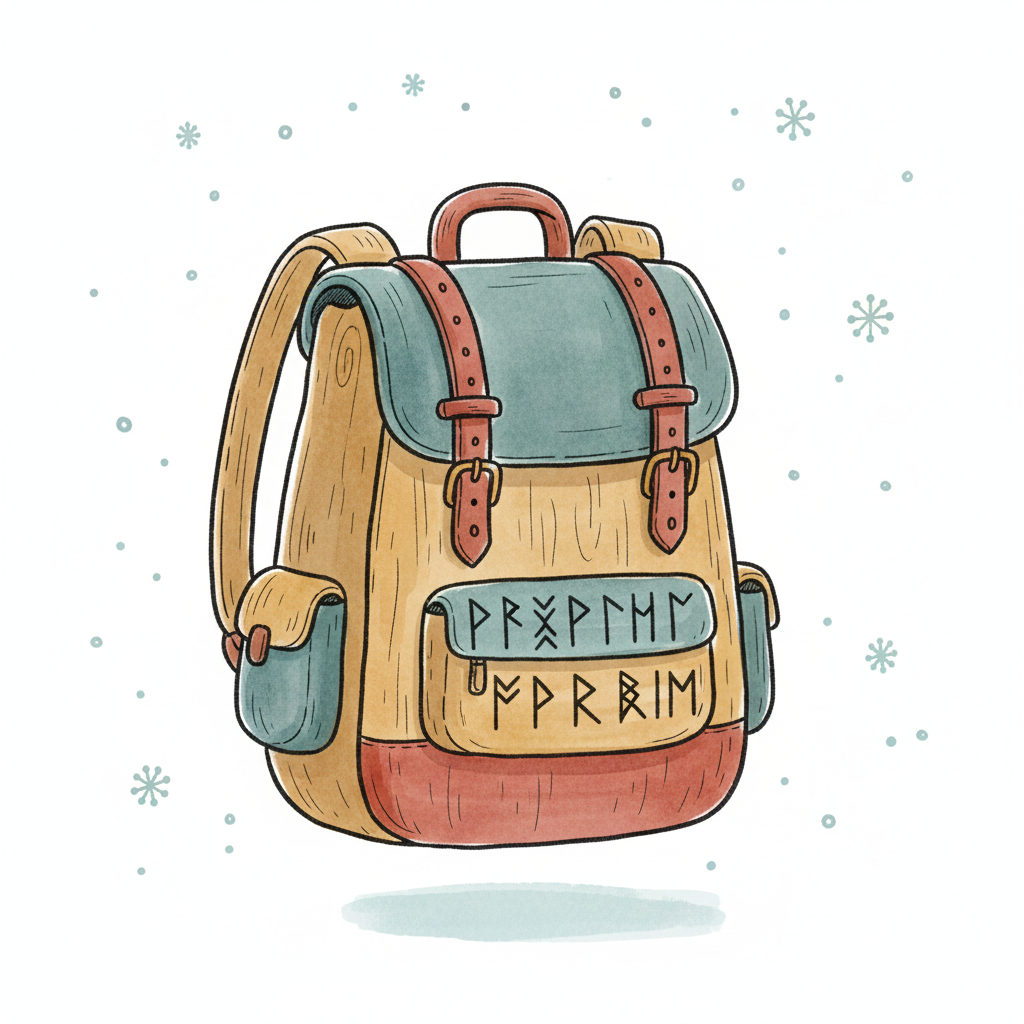 Illustrierter Rucksack mit Runen auf der Vordertasche und Schneeflocken im Hintergrund.