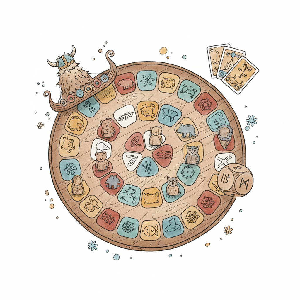 Illustriertes Wikinger-Brettspiel mit Tierfiguren, Runenwürfel und Karten auf Holzbrett.