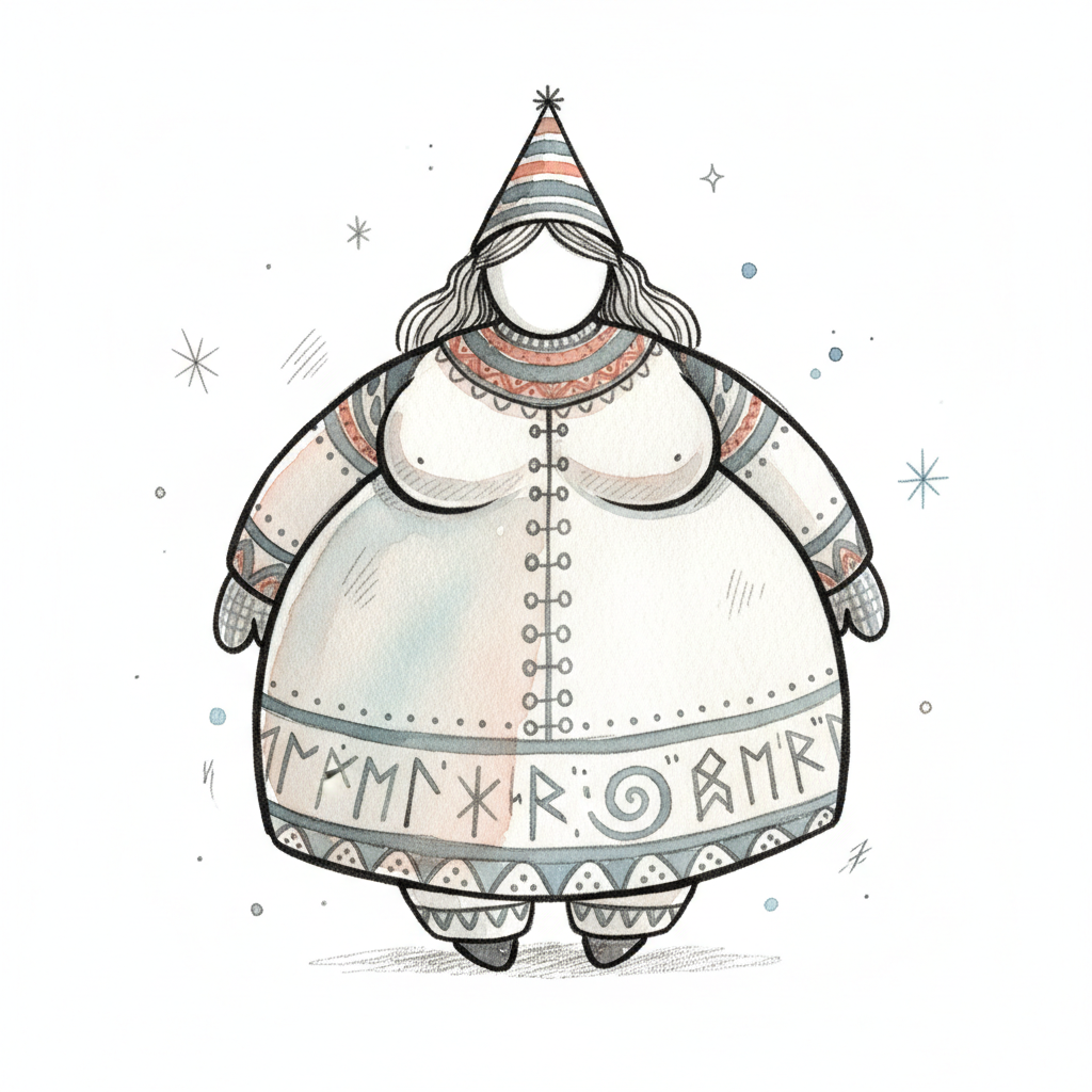 Stilisierte, mollige Figur in Winterkleidung mit Mütze und Runenmuster auf dem Mantel.