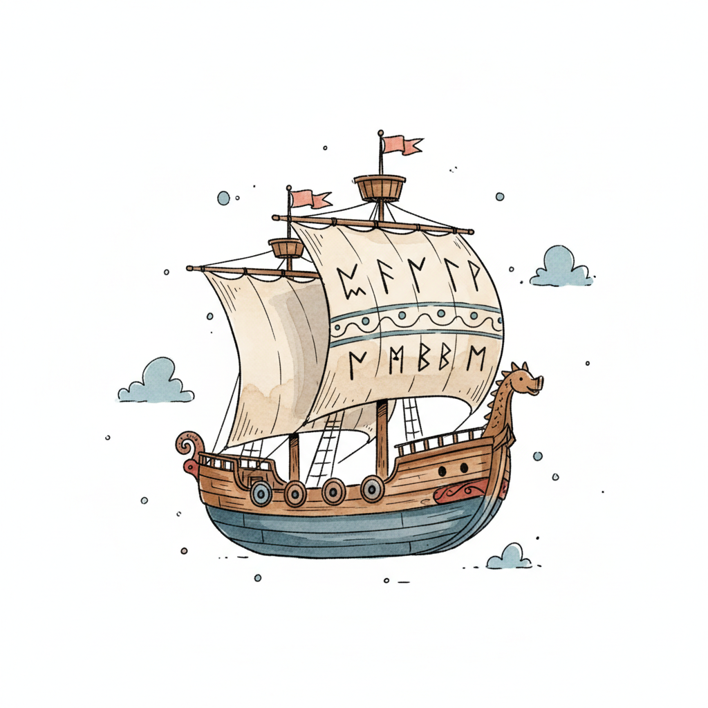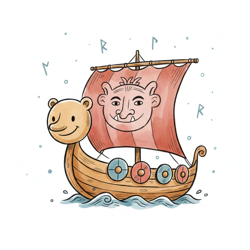 Niedliches Wikingerschiff mit Bärenkopf und Trollgesicht auf dem Segel, umgeben von Runen.