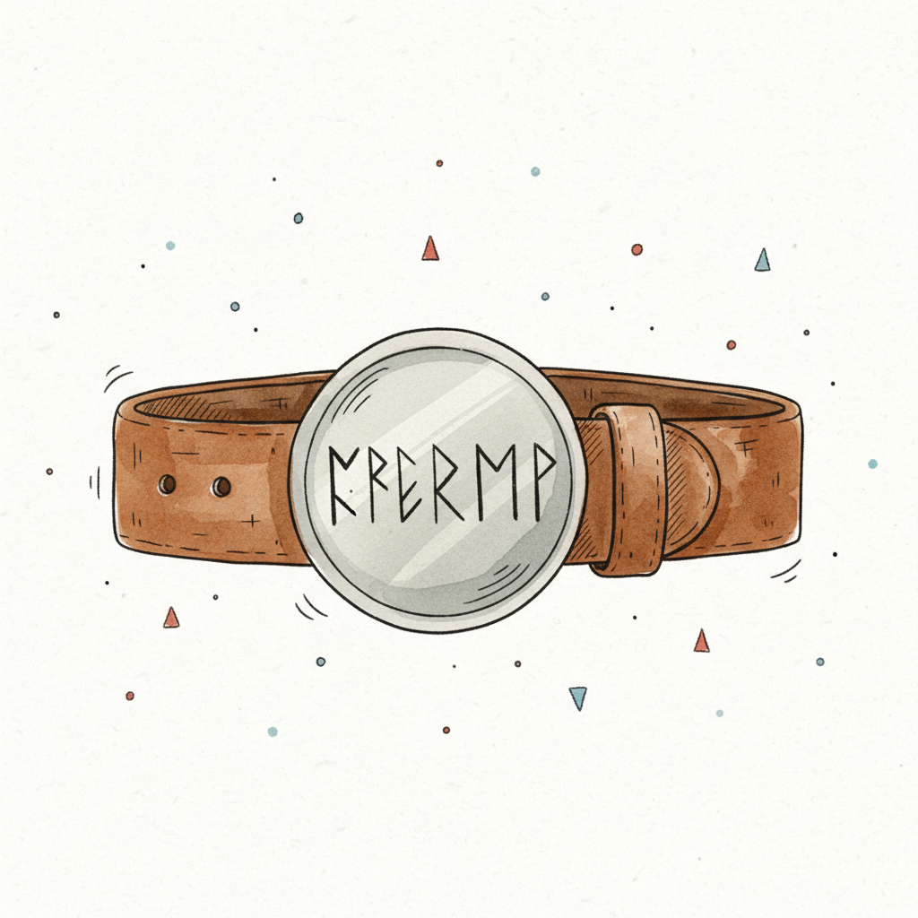 Brauner Ledergürtel mit runder Silberschnalle, die Runeninschrift "RPERMP" zeigt. Cartoon-Stil.