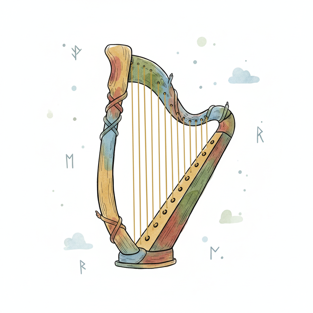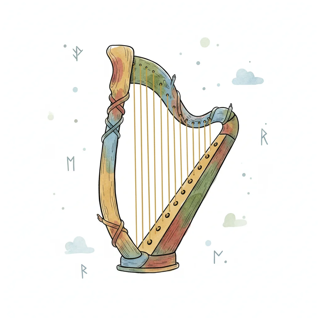 Aquarell-Illustration einer bunten Harfe mit Runen und kleinen Wolken auf weißem Hintergrund.