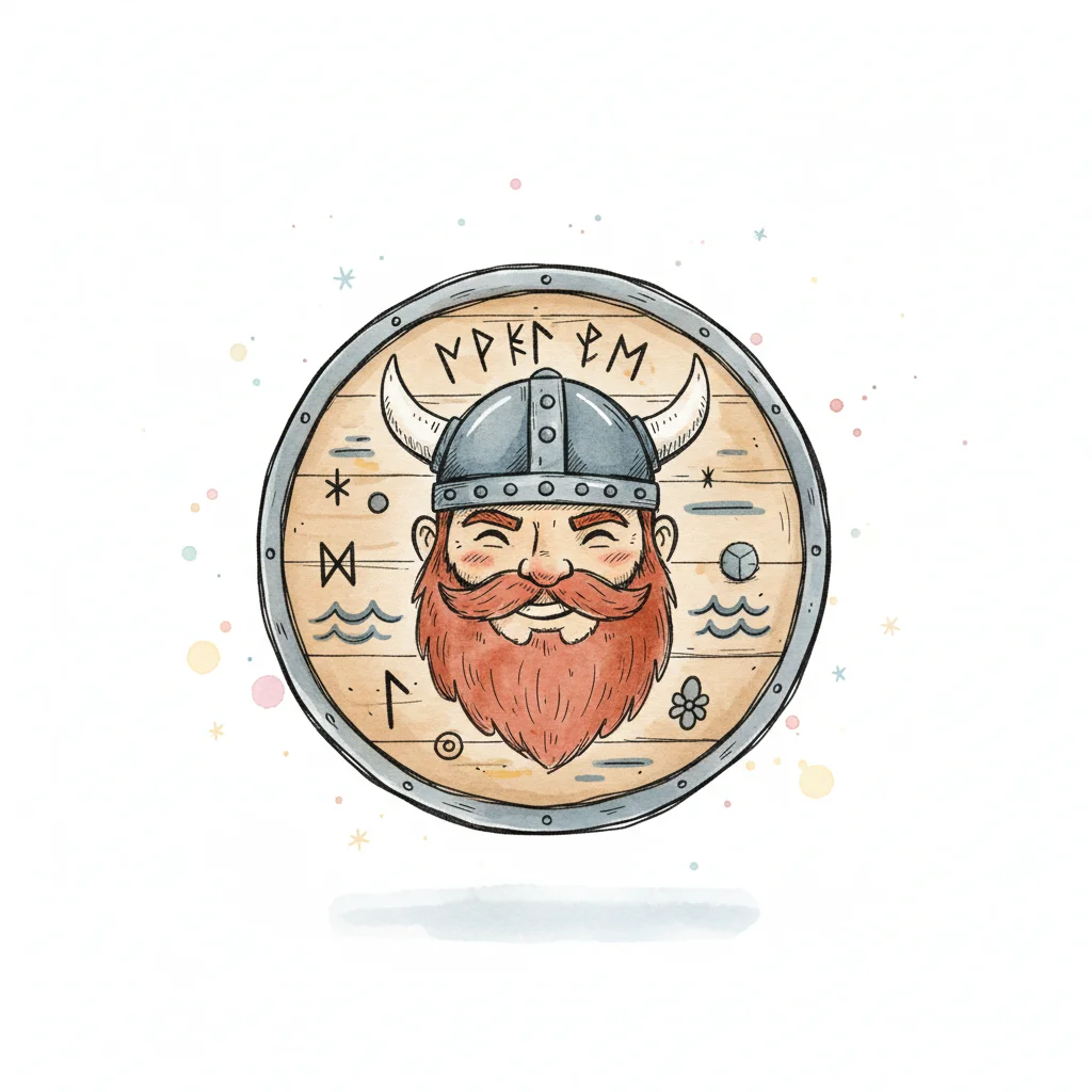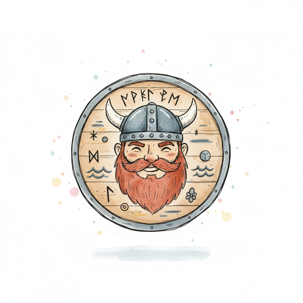 Cartoon-Vikingkopf mit gehörntem Helm, rotem Bart und ernstem Blick, umgeben von Runen.