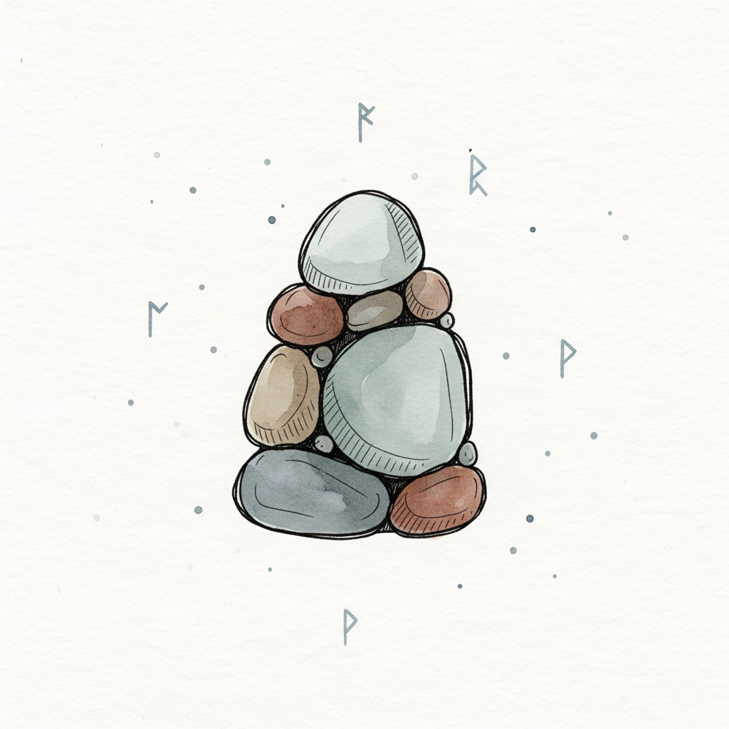 Bunte, gestapelte Steine (Cairn) mit Runen und Punkten im Aquarellstil auf hellem Grund.