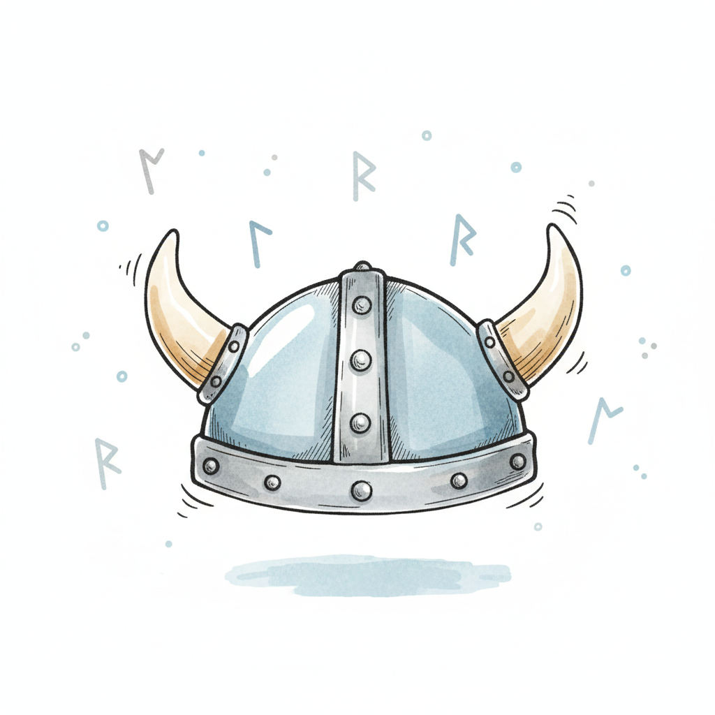 Illustrierter Wikingerhelm mit Hörnern und Runen auf weißem Hintergrund im Cartoon-Stil.