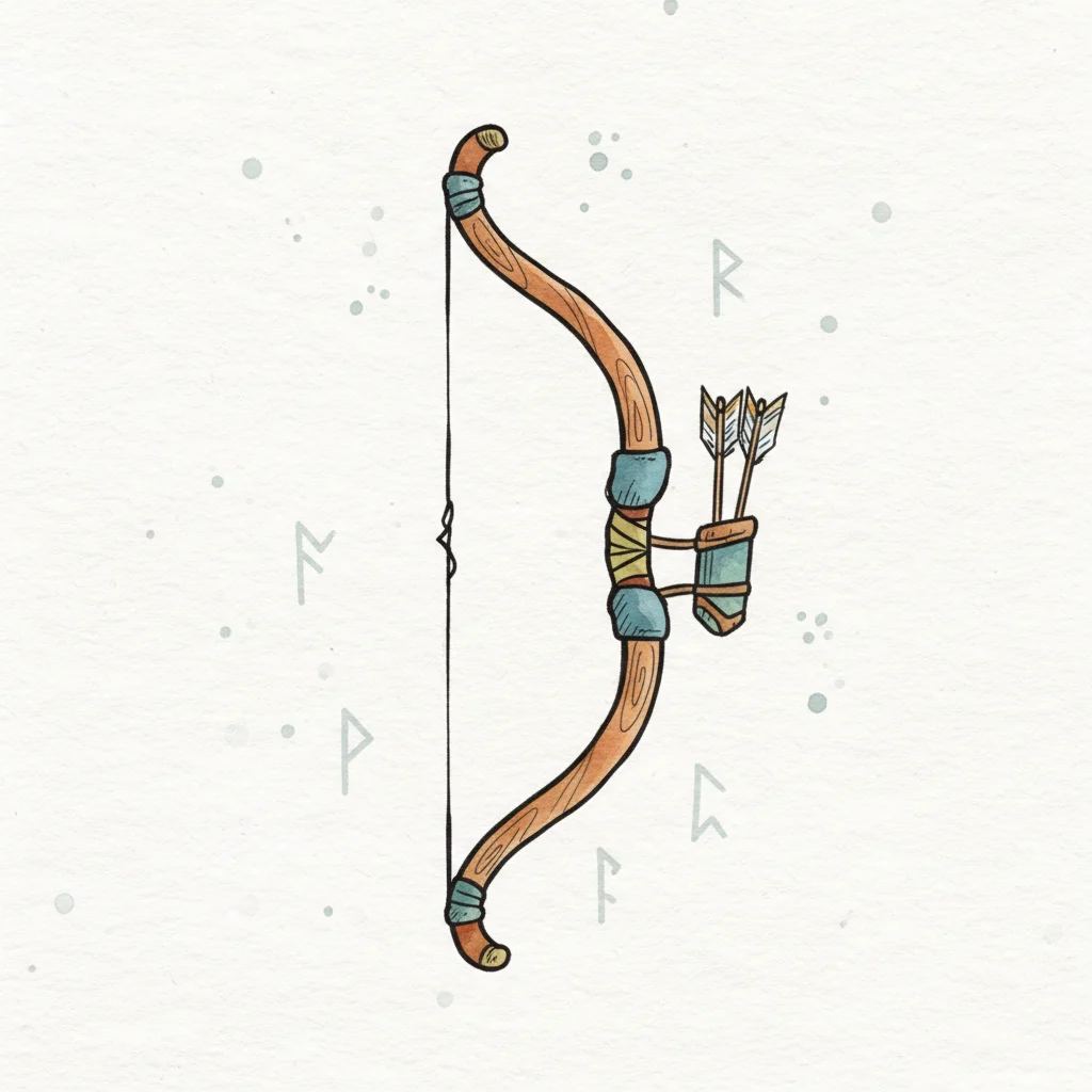 Handgezeichneter Bogen mit Köcher und drei Pfeilen auf hellem Hintergrund mit Runen.