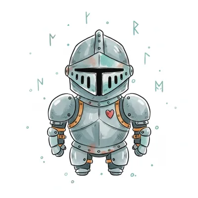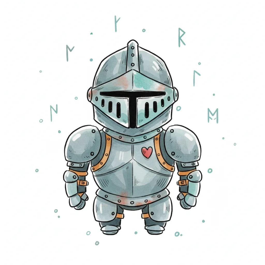 Niedlicher Cartoon-Ritter in glänzender Rüstung mit rotem Herz auf der Brust, umgeben von Runen.