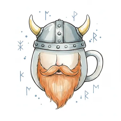 Eine Tasse im Wikinger-Stil mit Helm und rotem Bart, umgeben von Runen.