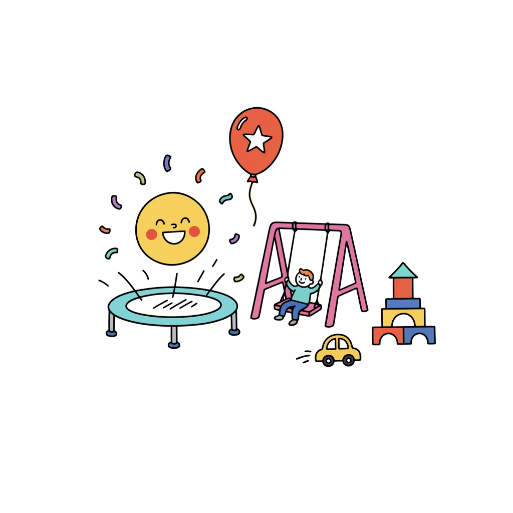 Spielplatz mit Trampolin, Schaukel, Ballon und Spielzeugauto.