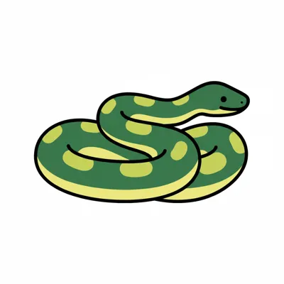Eine grüne Schlange mit gelben Flecken, schlängelnd und cartoonhaft.
