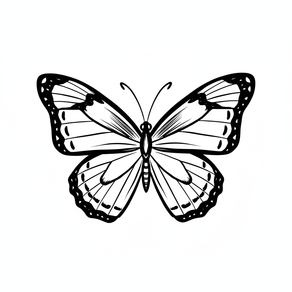 Schwarz-weiß gezeichneter Schmetterling mit detaillierten Flügeln.