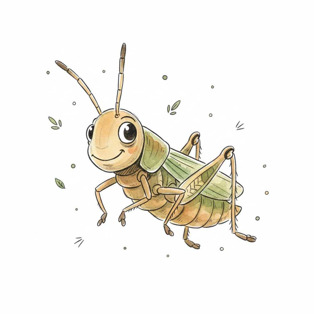 Eine fröhliche, cartoonartige Heuschrecke mit großen Augen und vielen kleinen Details.