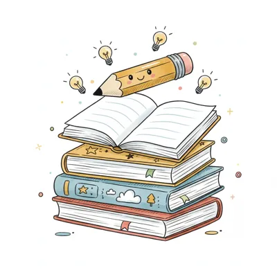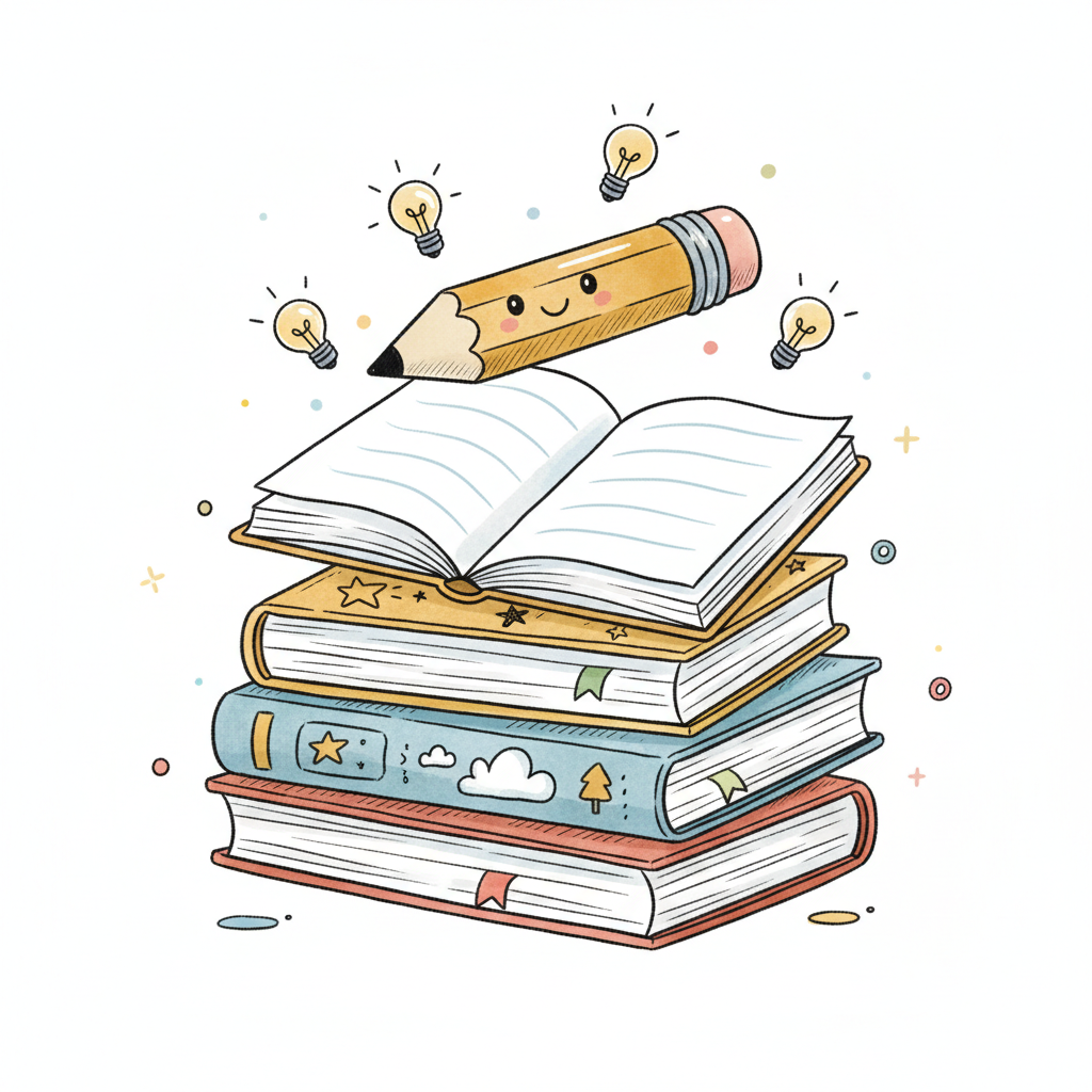 Ein Stapel bunter Bücher mit einem fröhlichen Bleistift und Glühbirnen.