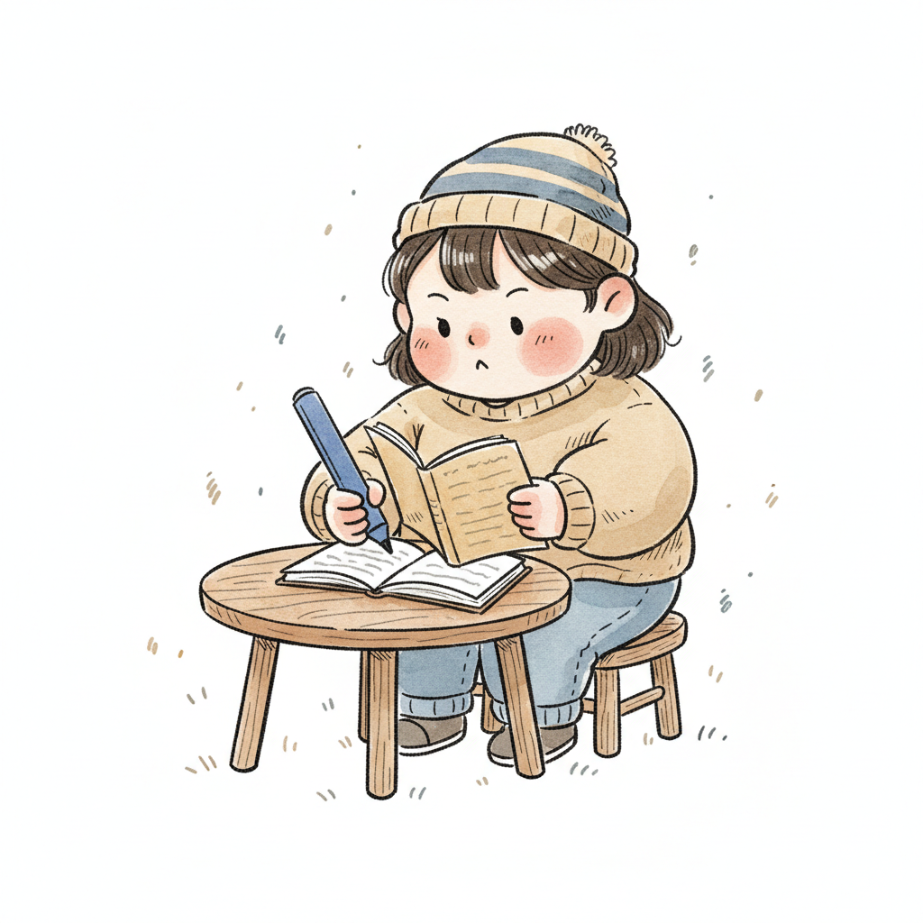 Niedliche, kindgerecht illustrierte Szene mit einem Kind oder einer Person als Hauptfigur, vor rein weißem Hintergrund, im frech-nordischen Aquarell-Skizzenstil. Klare, leicht wackelige Tuschekonturen, sichtbare Pinsel- und Strichtextur, dezente Schraffuren, weiche handgemalte Farbflächen in gedeckten Farben. Einfache, runde Formen. Keine harten Schatten, sondern sanfte, transparente Aquarellschichten. Leicht raue, handgezeichnete Linien statt glatter Vektorkanten. Subtile, vereinzelte Kritzelpunkte oder kleine Details im Hintergrund (wie Pünktchen oder feine Striche), aber keine echte Umgebung oder Landschaft. Die Figur ist mittig zentriert. Insgesamt charmant, humorvoll, warm und handgemacht wirkend. WICHTIG: Das Bild darf ABSOLUT KEINEN TEXT, KEINE BUCHSTABEN und KEINE ZAHLEN enthalten.
