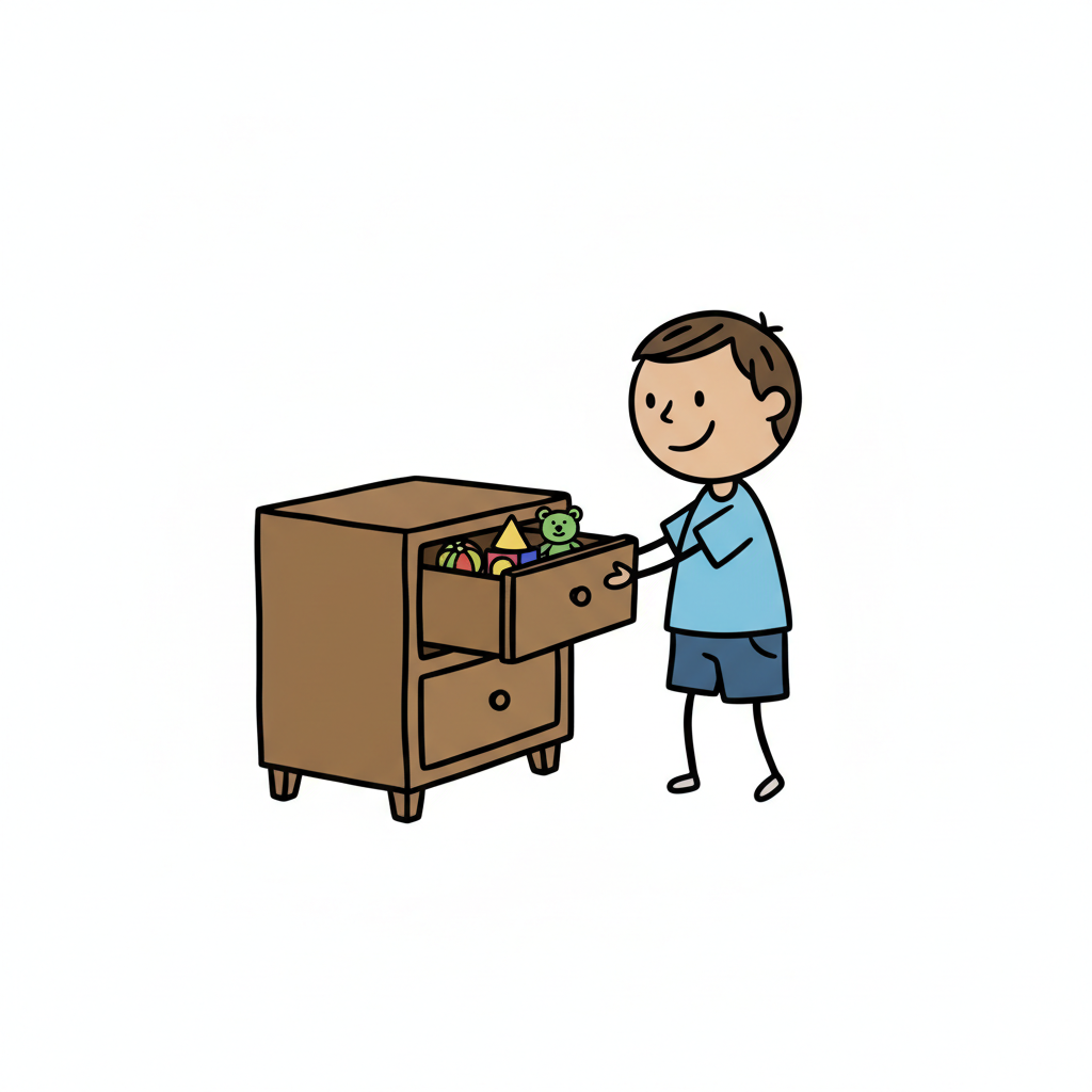 Ein Junge zieht eine Schublade auf und entdeckt Spielsachen.