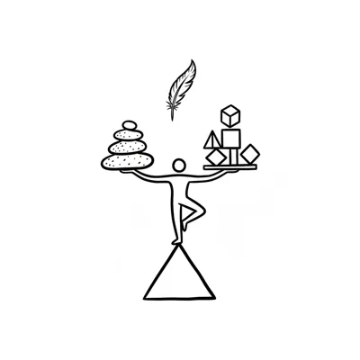 Strichfigur balanciert Steine und geometrische Formen auf einer Waage, steht auf Dreieck.
