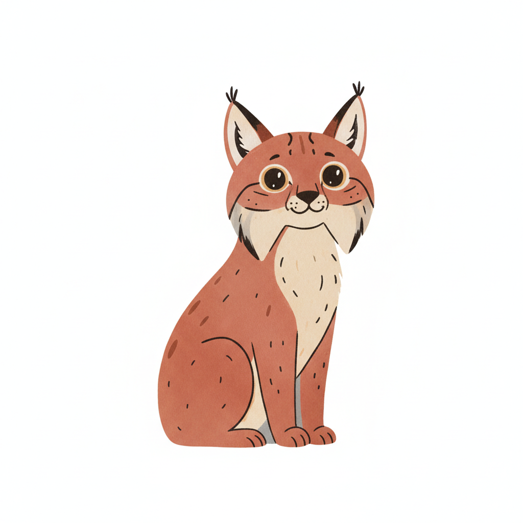Eine stilisierte Zeichnung eines sitzenden Luchses mit großen Augen.