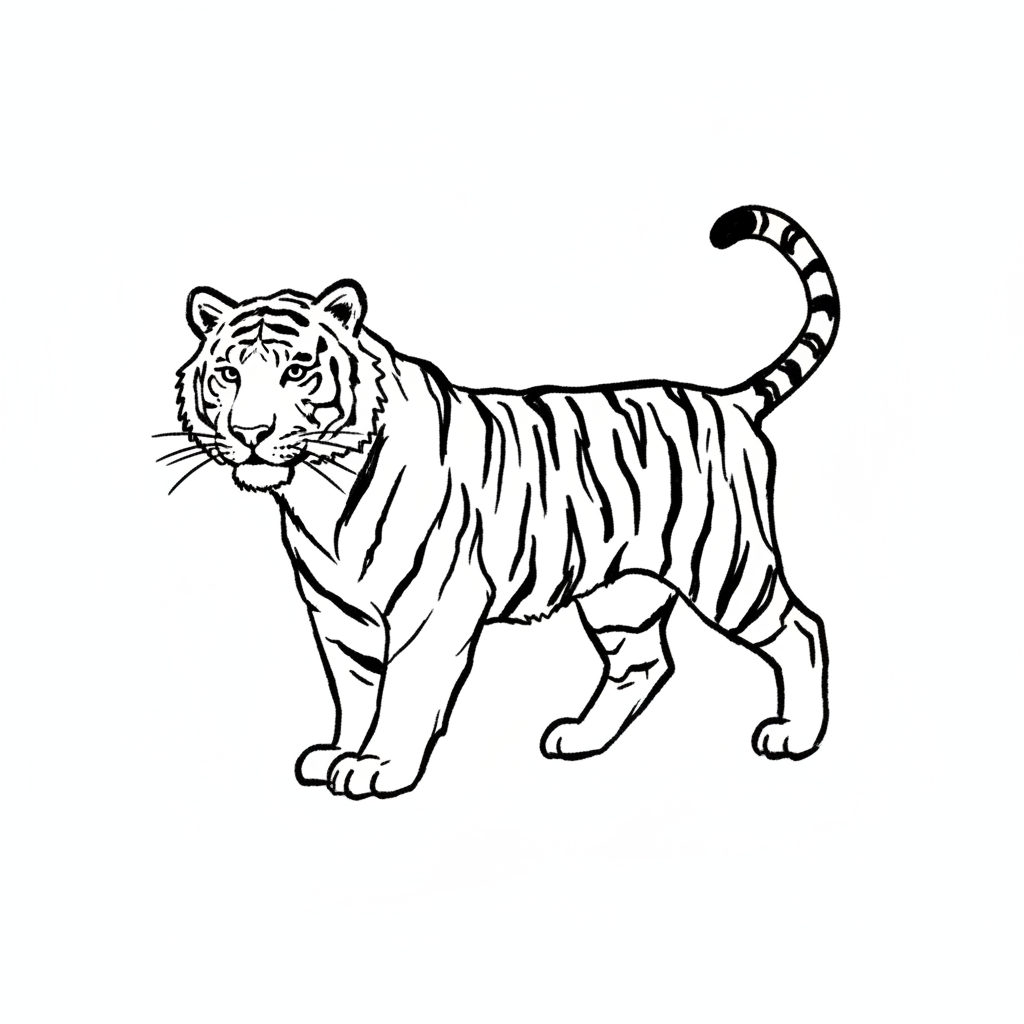 Ein stehender Tiger mit charakteristischen Streifen und Blick.