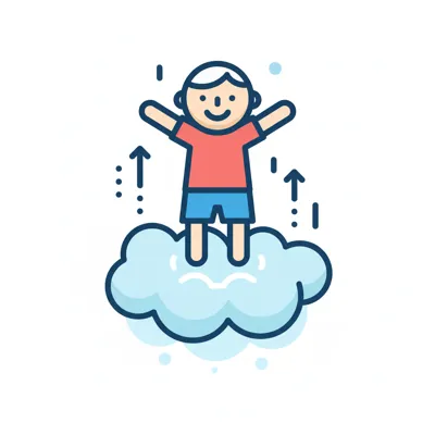 Glücklicher Junge steht auf einer Wolke mit erhobenen Armen, umgeben von aufsteigenden Pfeilen.