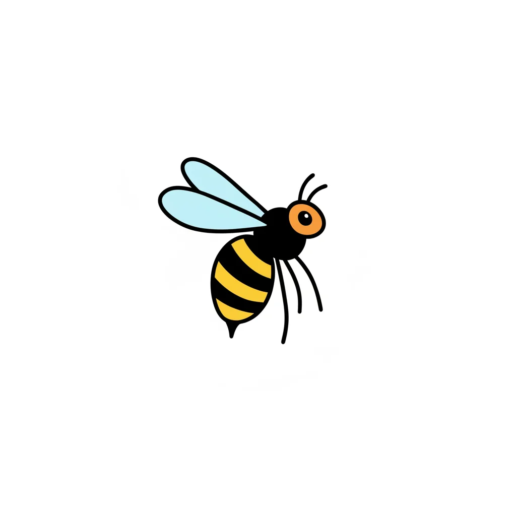 Niedliche Cartoon-Biene mit gelb-schwarzen Streifen und hellblauen Flügeln auf weißem Grund.