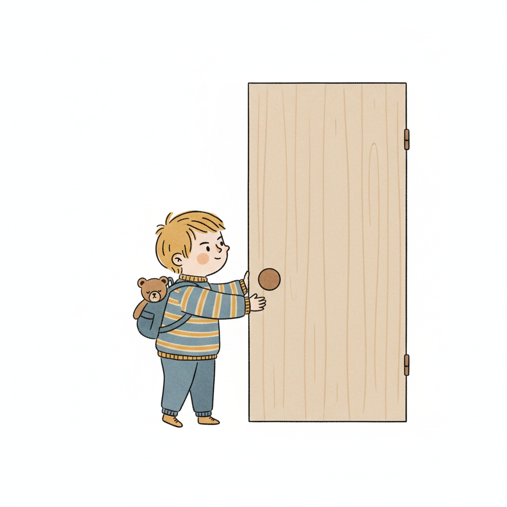 Ein Junge steht vor einer offenen Tür mit einem Rucksack und einem Teddy.