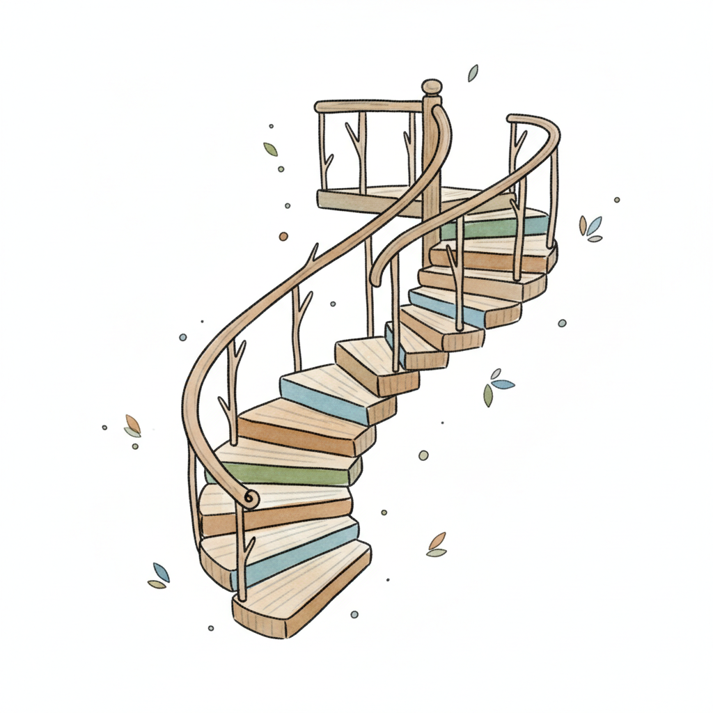 Bunte, geschwungene Treppe mit natürlichen Elementen und Pflanzenmotiven.