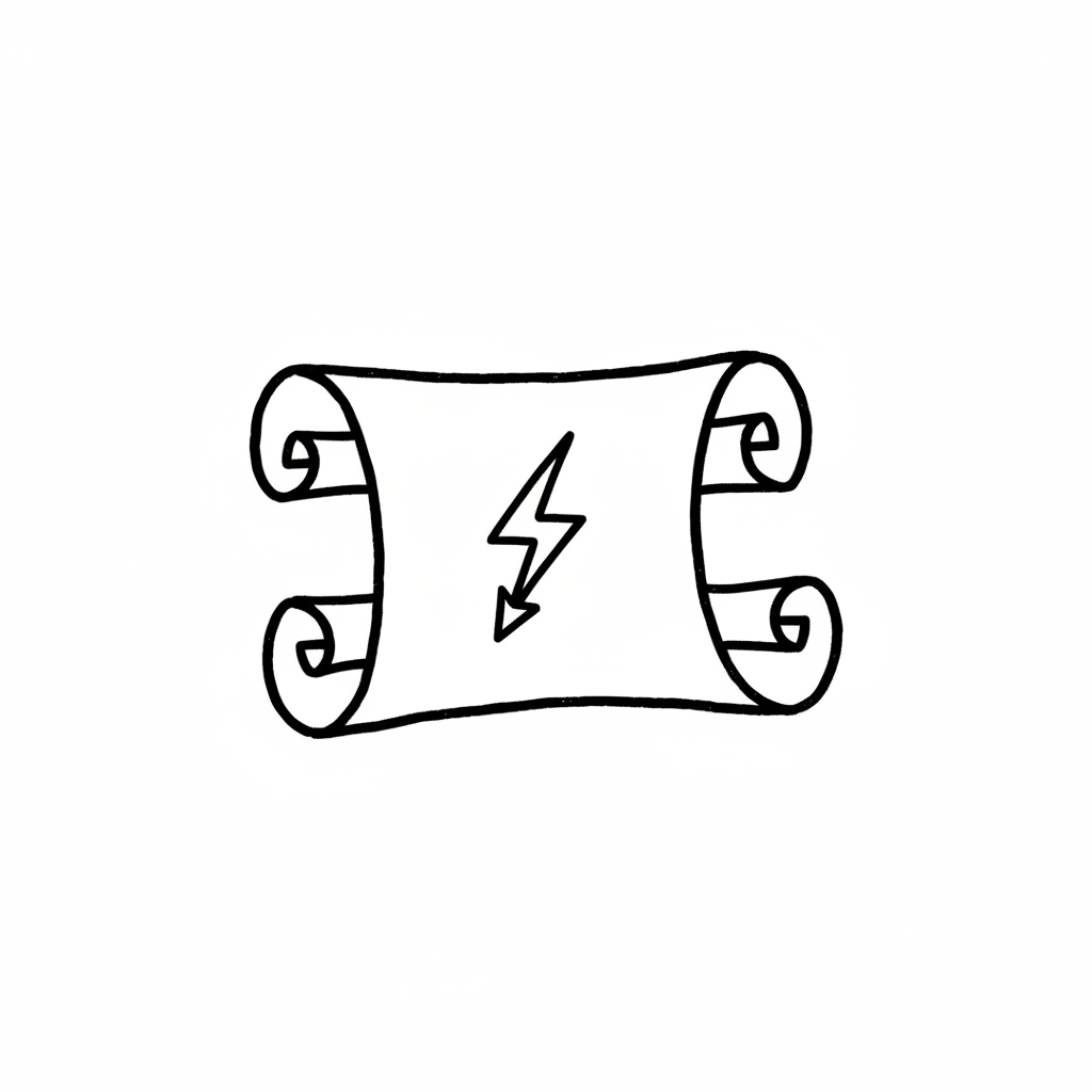 Schwarz-weiße Skizze einer Schriftrolle mit Blitzsymbol in der Mitte.