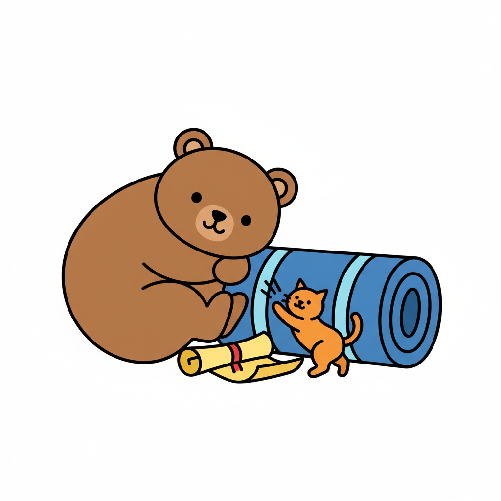 Ein süßer Bär sitzt neben einer blauen Matte, während ein Kätzchen damit spielt. Eine Schriftrolle liegt daneben.