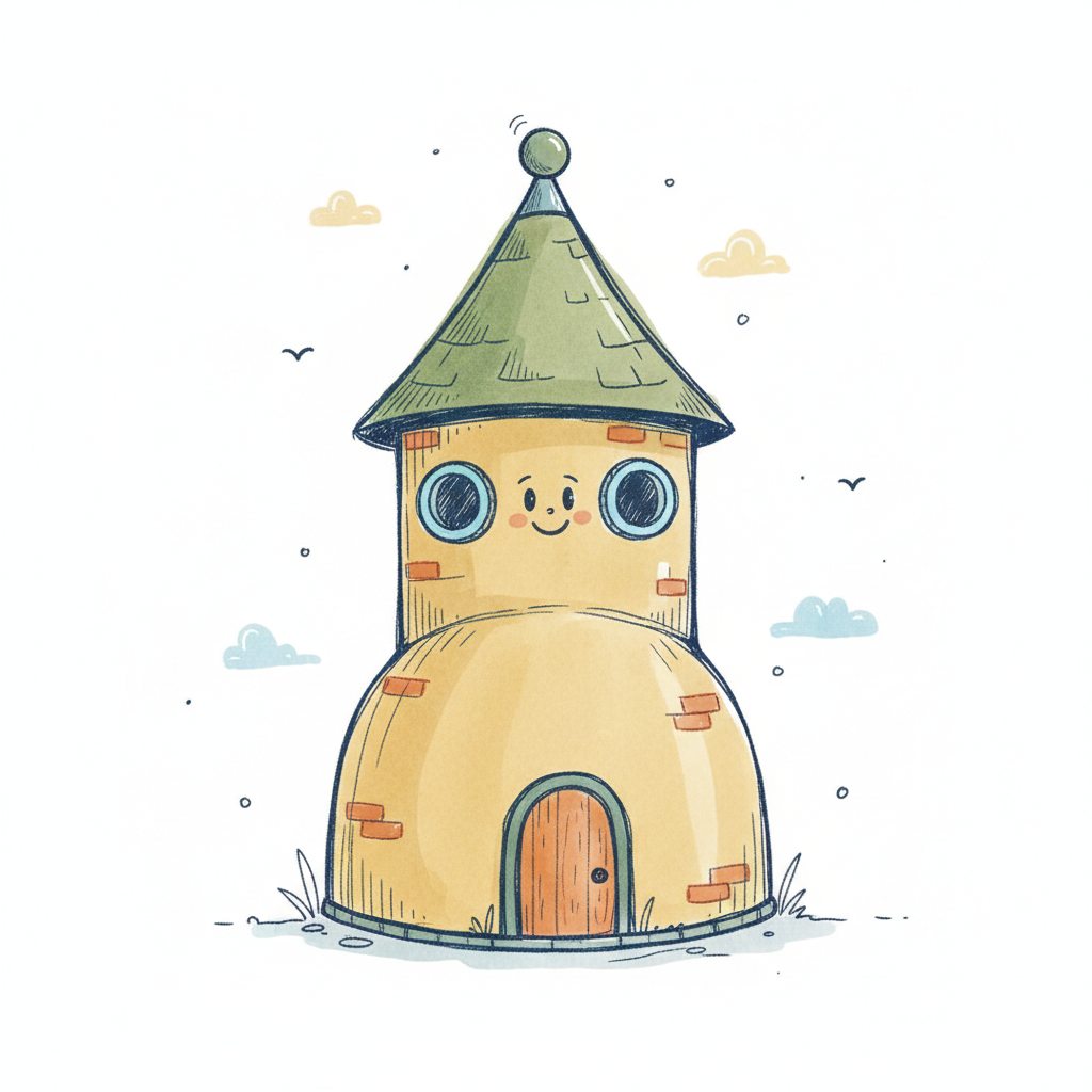Ein freundliches, stiefelförmiges Haus mit Gesicht und grünem Dach, gezeichnet im Aquarellstil.