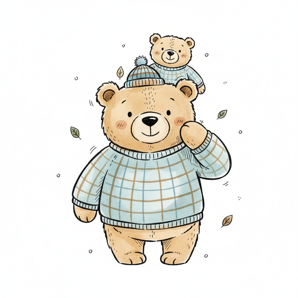 Ein niedlicher Bär in einem Pullover mit einem kleinen Bären auf dem Kopf.