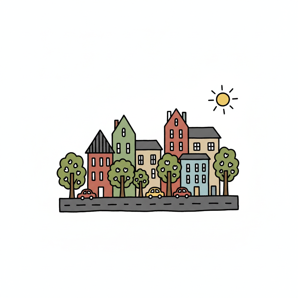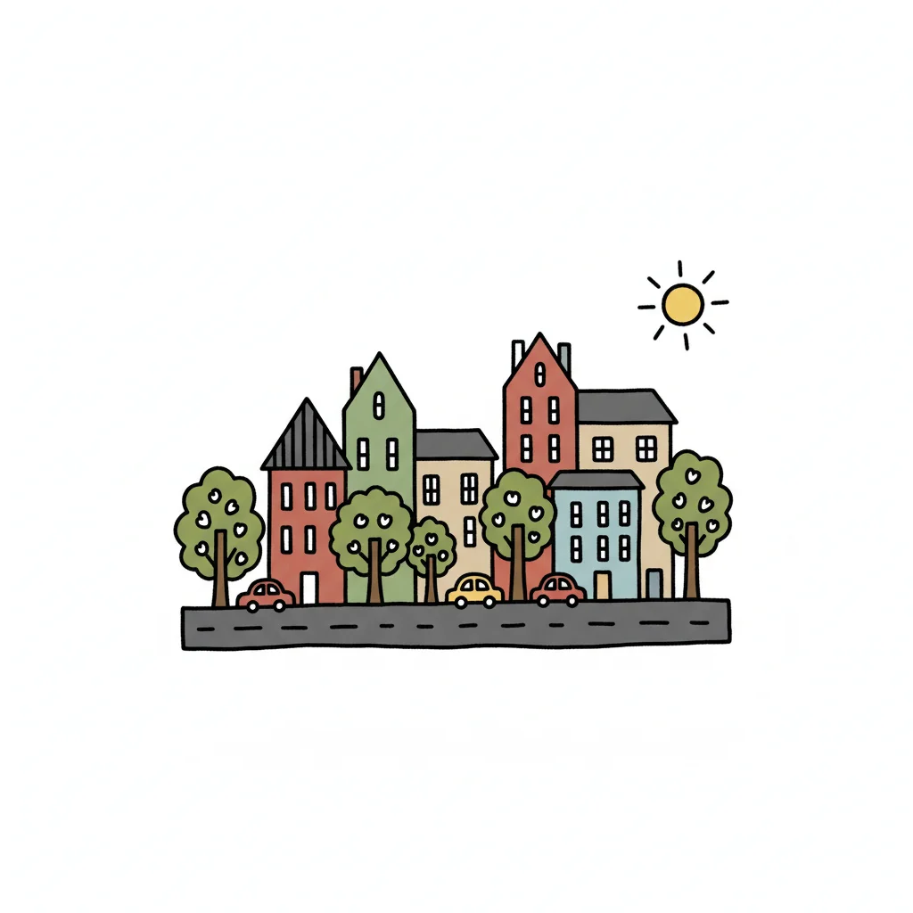 Niedliche, handgezeichnete Stadtansicht mit bunten Häusern, Bäumen, Autos und Sonne.