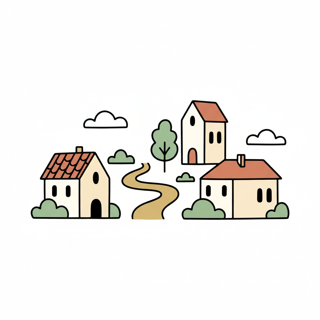 Niedliche Illustration von drei Häusern, einem Weg, Baum und Wolken in minimalistischem Stil.
