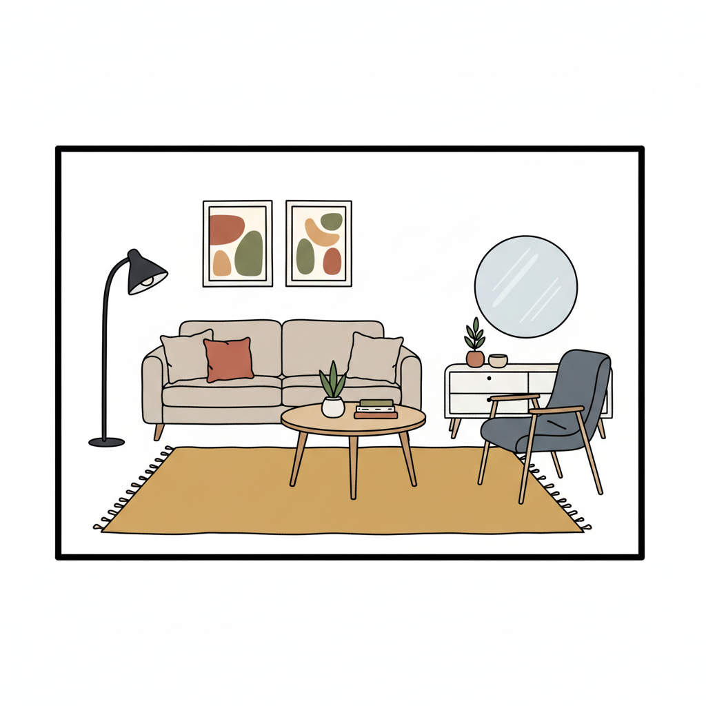 Stilvolle Illustration eines Wohnzimmers mit Sofa, Sessel, Couchtisch und Wanddeko.