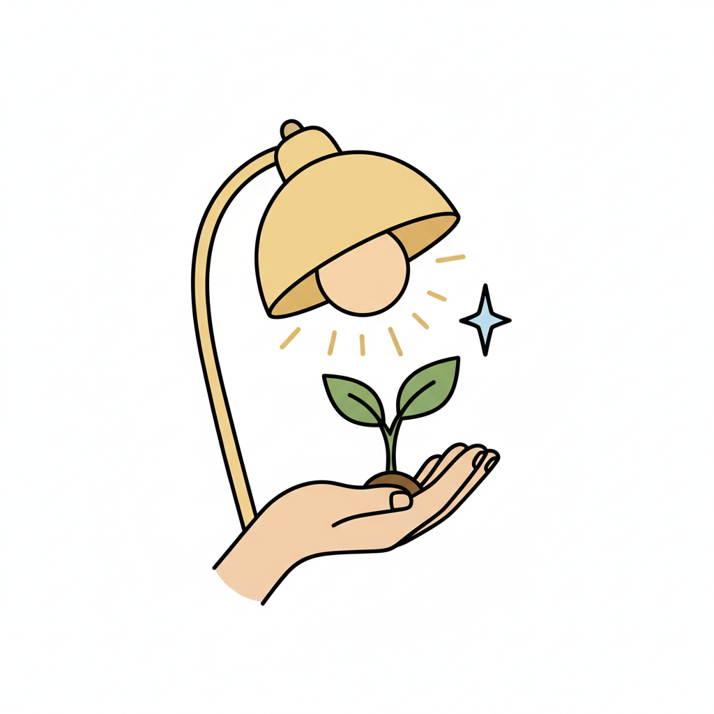 Eine Hand hält eine junge Pflanze, die von einer Lampe beleuchtet wird, symbolisiert Wachstum.