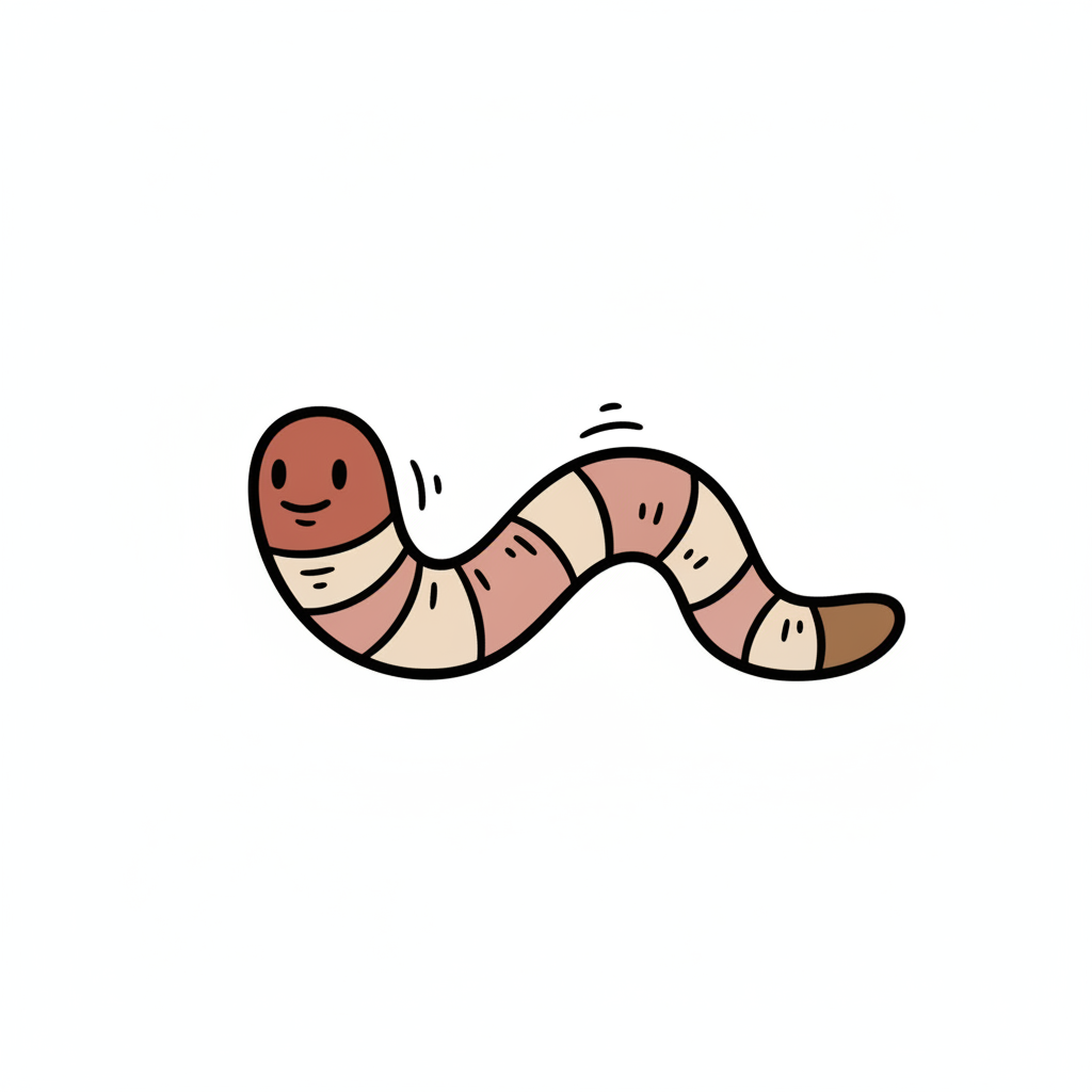 Ein glücklicher, schlängelnder Cartoon-Wurm in Rosa-Beige auf weißem Hintergrund.