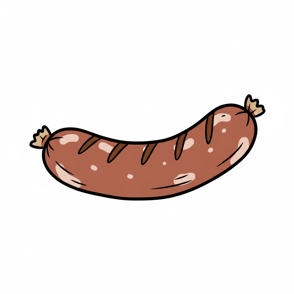 Eine braune, gegrillte Wurst im Cartoon-Stil mit Grillstreifen und gebundenen Enden.