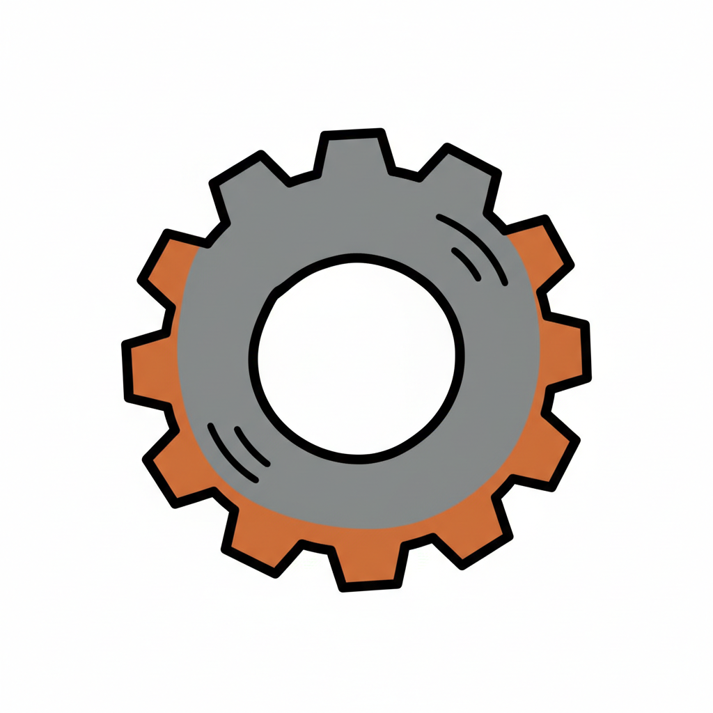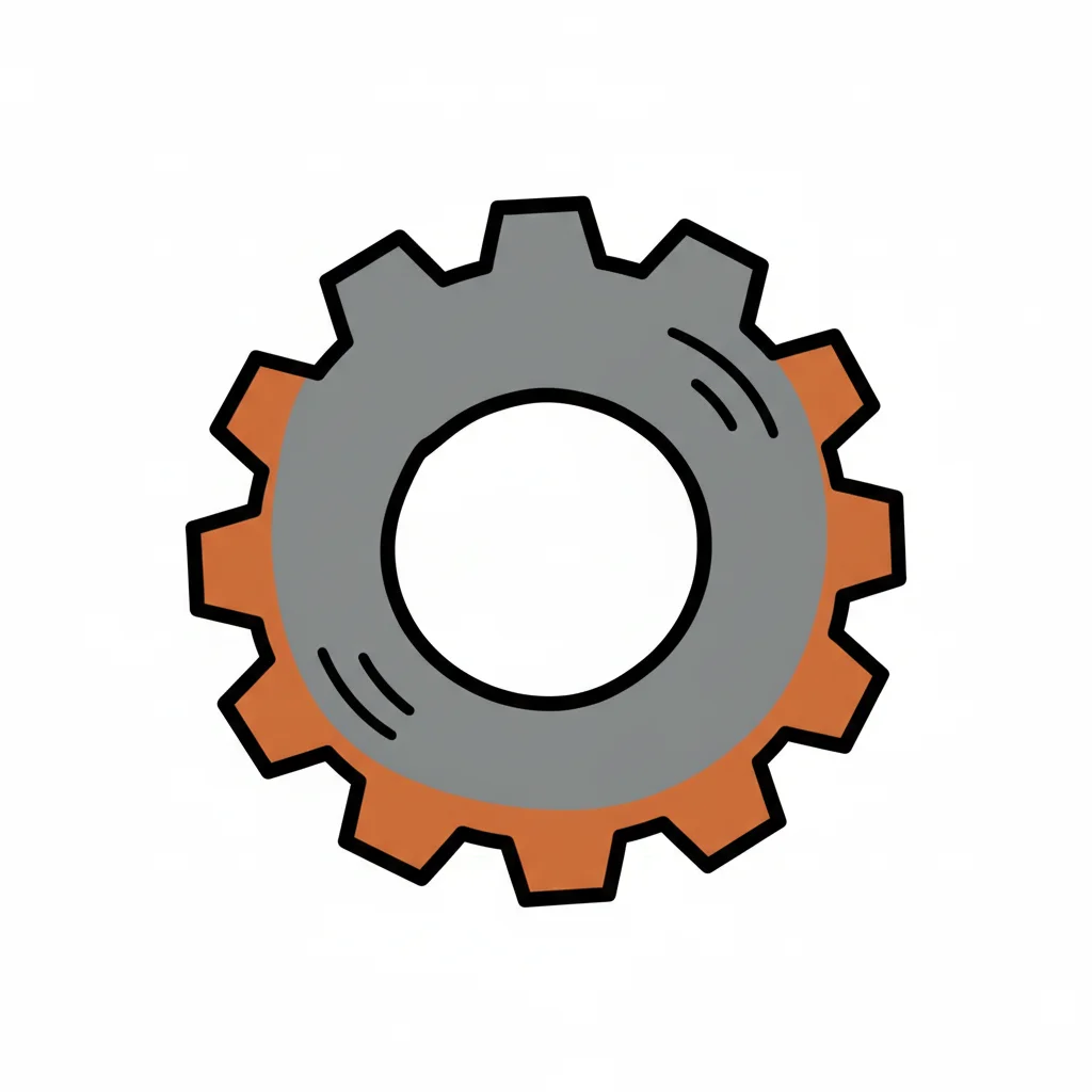 Einfaches, stilisiertes Zahnrad in Grau und Orange mit schwarzem Umriss auf weißem Hintergrund.