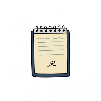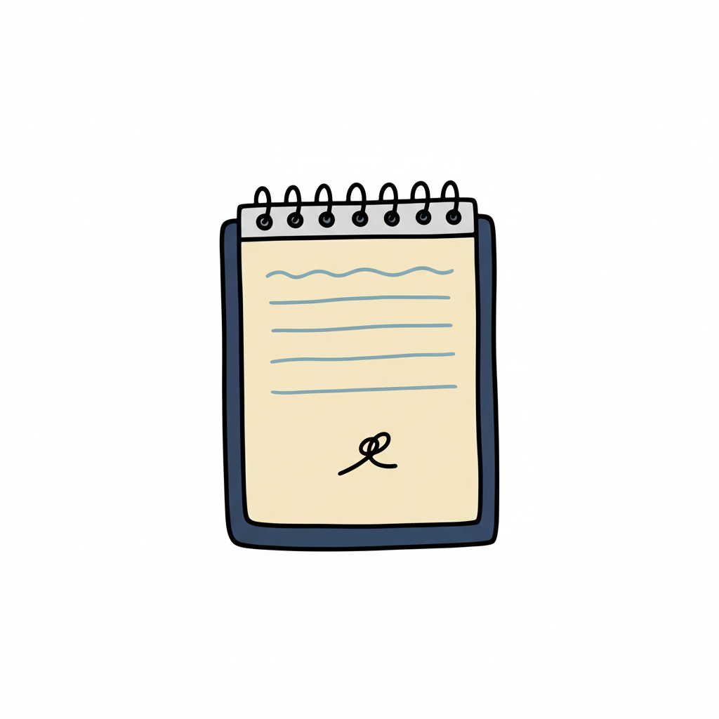 Handgezeichnetes Notizbuch mit Spiralbindung, linierten Seiten und einer Unterschrift.