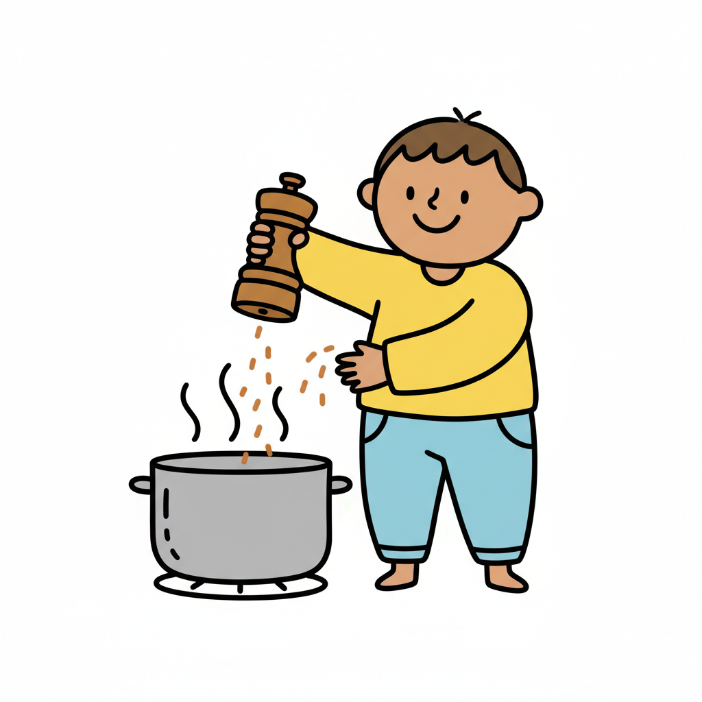 Ein lächelndes Kind würzt mit einer Pfeffermühle einen dampfenden Topf.