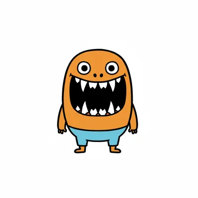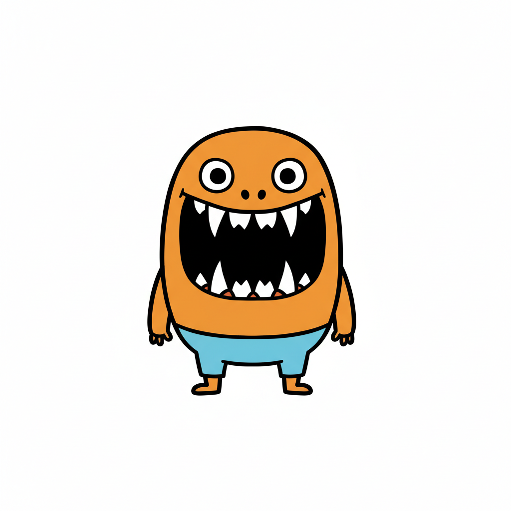 Orangefarbenes Cartoon-Monster mit großen Augen und offenem Maul voller spitzer Zähne.